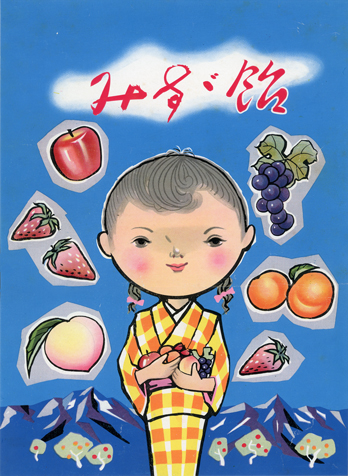 当時あった缶入りタイプのみすゞ飴のパッケージデザインです。従来のあんず・りんご・いちごに、ぶどうとももが加わった5種類の味になりました。