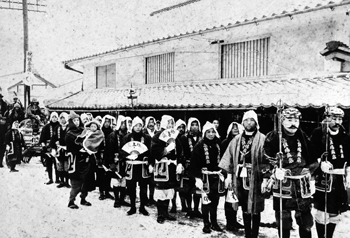 消防士に扮した社員の仮装行列のバックに映っている建物が、旧店舗です。大正時代に建て直された現在の洋風建築とは違い、表屋造りの純和風な建物でした。