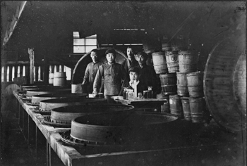 左に水飴を煮詰める蒸気釜が7基、右には製造した水飴を詰める樽が積まれています。