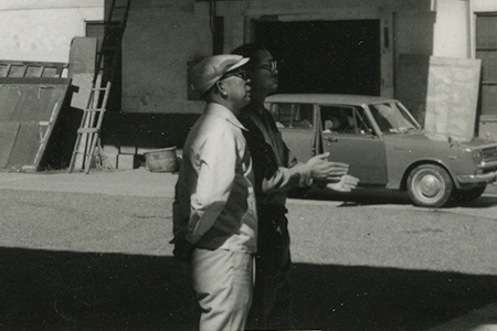 手前の人物が、繭倉の買取と保存を行った、2代目社長の飯島春三です。写真における背景は、昭和45年の購入前後の繭倉です。