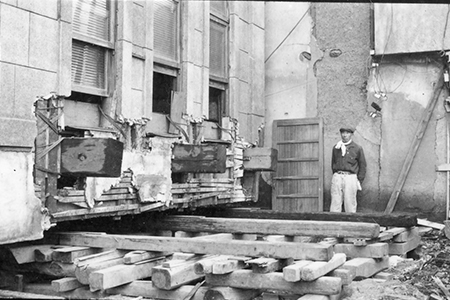 店舗棟を曳家している様子
