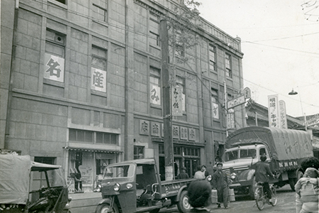 本社ビルとして建てられたものでしたので、当時は今のようなお店ではありませんでした。入口に大八車があることからも分かりますが、一階は卸売り用のみすゞ飴の出荷場でした。