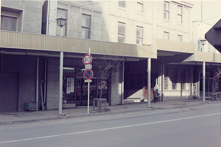 道路拡幅が終わった直後の店舗棟の様子です。商店街近代化事業によりアーケードが設置され(現在は撤去)、周囲の様子も一変しています。