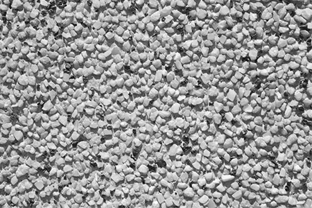 小さな玉砂利を混ぜたモルタルを壁に塗り、水を含んだ筆でモルタル部分を洗い落として玉砂利を浮き上がらせる工法(洗い出し)により、まるで石の表面のような造形に仕上げています。