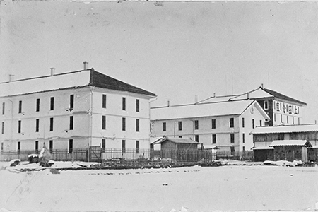 明治37年1月に撮影された、上田駅前に建ち並ぶ繭倉の風景です。