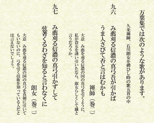 こぼれ話ですが、昭和中期に国文学者である武田祐吉が「み薦」を「みすゞ」と読むのは誤読であり「みこも」と読むのが正しいと提唱し、現在では「みこもかる」の読みが学術的には通説となっています。しかし、「みすゞかる」には古風な美しい響きがあり、万葉の時代を想起させるにふさわしいため、信濃の国の枕詞として現在でも親しまれ続けています。