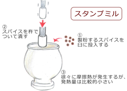一般的なスパイスを挽く方法としては、グラインドミル(石臼やコーヒーミルのように、ヤスリ状のものですり潰す方式です)、ハンマーミル(ハンマー状のものがついた円筒を回転させて、対象物を衝撃や摩擦によって粉砕する方式です)、スタンプミル(餅つきのような動作で、杵と臼とで対象物をついて叩き潰す方式です)、 を使って挽いています。