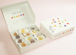 1粒ずつ個包装し、6種類のお味「あんず」「三宝柑」「ぶどう」「うめ」「りんご」「すもも」を5粒ずつ詰め合わせてご用意致しております。