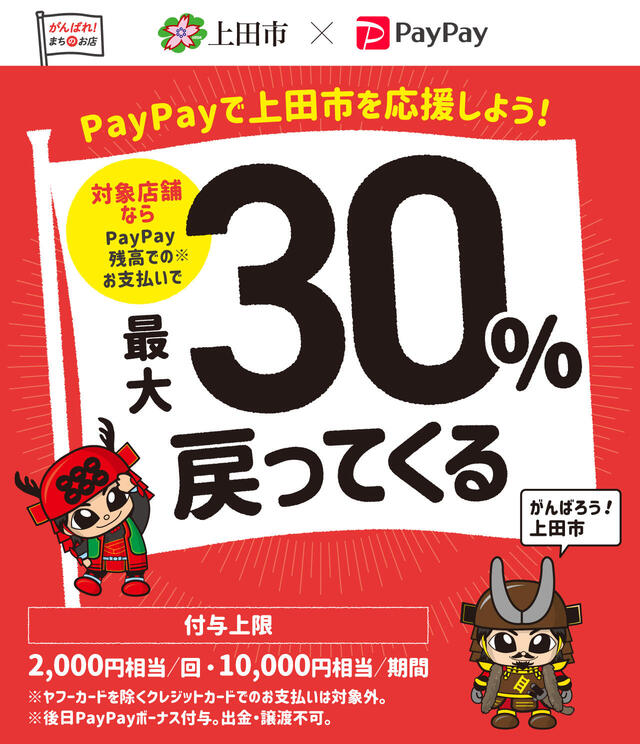 上田市のPayPay加盟店にて、期間中PayPay残高でお支払いすると、最大30%のPayPayボーナスを還元キャンペーンを実施いたしております。