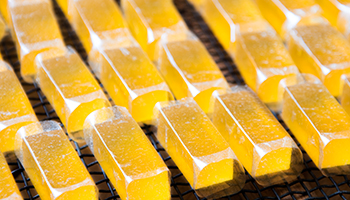 果汁に水飴と砂糖と寒天を溶かして練りこんでいきます。繊細な天然の色と香りを壊さないように、 煮詰めの作業は職人の手で慎重に行われています。これを箱に入れて固めると、生飴になります。