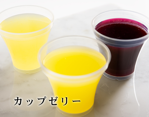 カップゼリーは生ゼリーよりもさらにみずみずしさをアップさせ、フルーツジュースの味を大切にしたゼリーでございます。厳選されたフルーツを寒天で凝縮させたカップゼリーにて、他では味わえないフルーツ本来のさわやかさをお楽しみ下さいませ。