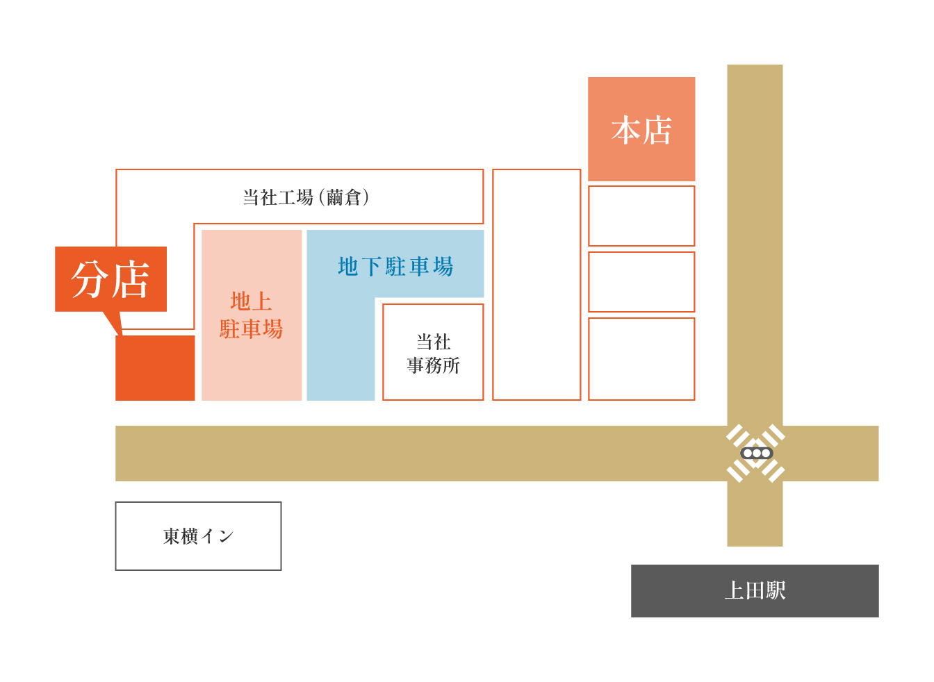 上田本店駐車場に直結したロケーション。お車を降りてからお近くで、すぐにお買い物をしていただけます。